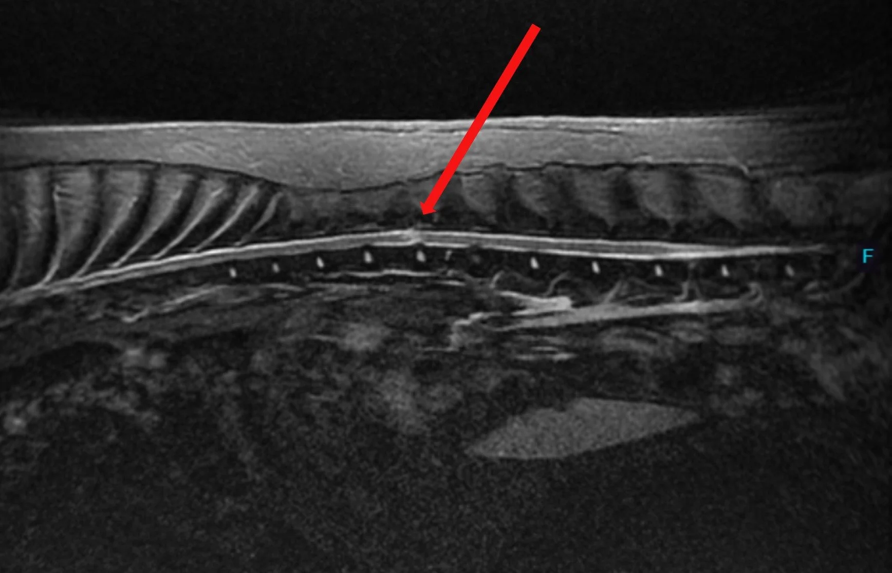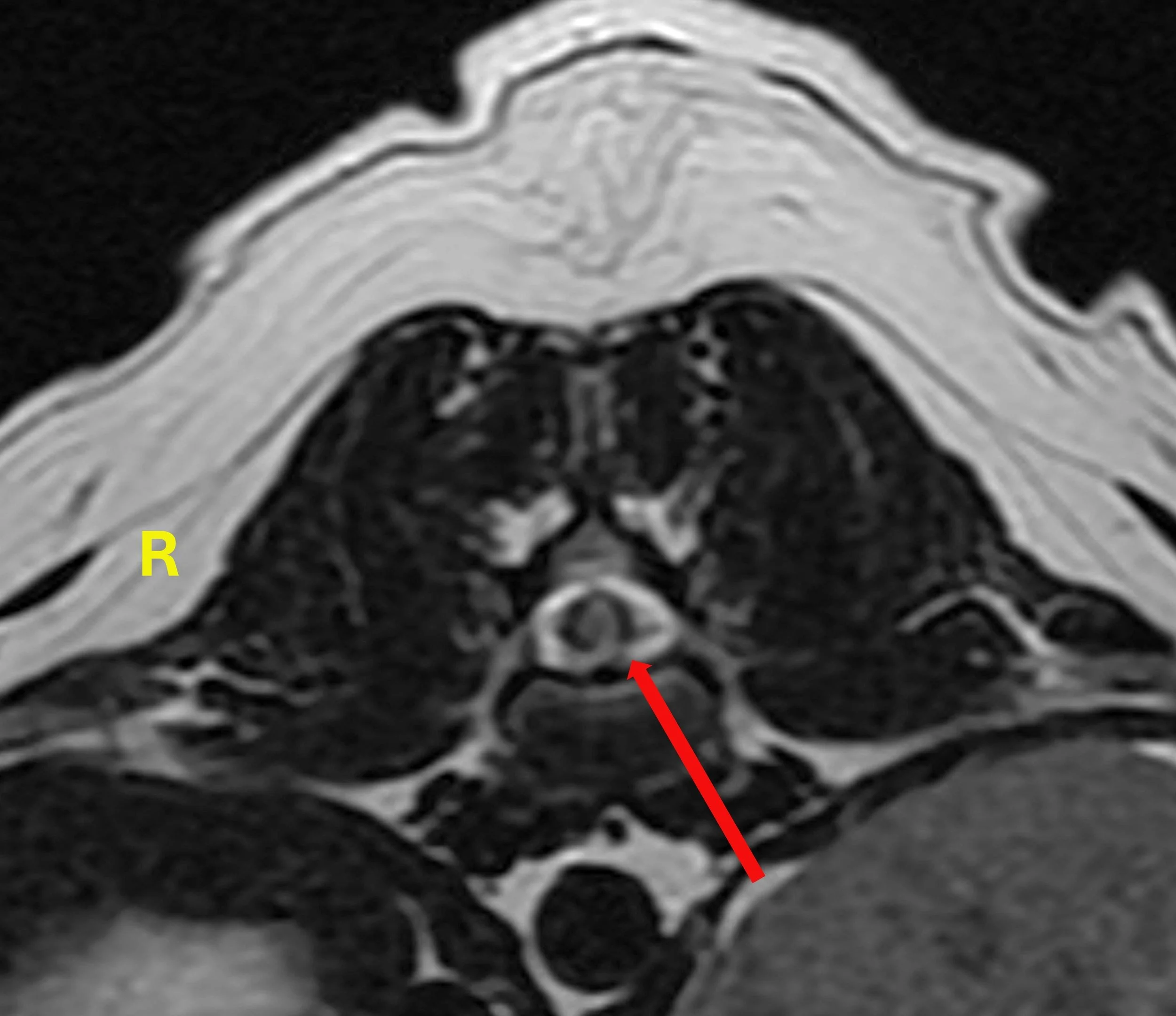 Axial view of Juno’s spine at the level of the T13-L1 disk space - MRI T2W sequence. The red arrow points towards the bright spot on the left side of the spinal cord (left and right projections are opposite in imaging figures).