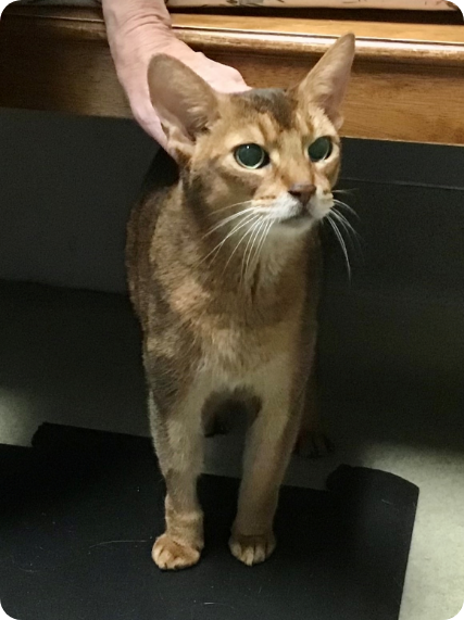 Angie, a 9 ½-year-old female spayed Abyssinian cat presented to us with back pain and inability to jump on furniture. Her examination indicates a problem within the thoracolumbar spine and focal pain in the middle of her thoracic spine.